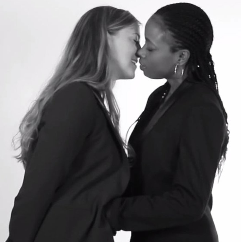 Holding her up while her legs are wrapped around while standing on a skateboard.