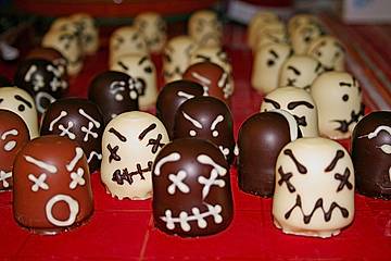 Kuvertüre getrennt über dem Wasserbad schmelzen lassen. Nicht zu heiß werden lassen und immer mal wieder umrühren. Anschließend jede Sorte in einen kleinen Gefrierbeutel füllen, verschließen, eine ganz kleine Ecke des Beutels abschneiden und die Schokoküsse mit Gruselgesichtern verzieren.